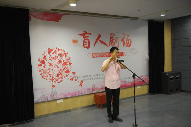 当然,在“盲人剧场”的活动中,视障群体从来就不止是听众。每一期“盲人剧场”都会邀请金陵图书馆的盲人读者代表与文化志愿者一道登台献艺,在满足视障群体文化需求的同时,也为其提供一个表达自我、展示特长、携手他人共同成长的广阔平台。在本期活动现场,不仅有来自南京市盲人协会两位带来的朗诵《面朝大海,春暖花开》,更有手佳员工侯硕表演的笛子独奏《枉凝眉》。一喜一忧,一起一落,表演者用声音、气息和指尖的灵动表达着自己对文学作品的理解。鼓楼区盲协的表演者表示,因为平日里并没有太多机会与这么多朋友欢聚,兴趣爱好也无处施展,所以非常喜欢“盲人剧场”这样的交流平台。