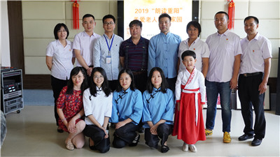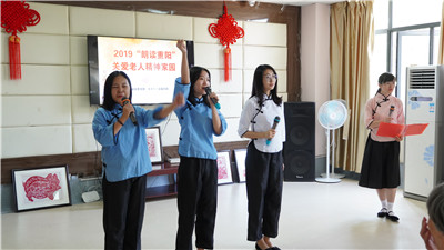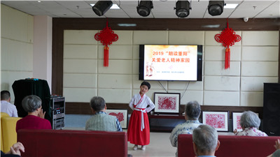随后,“朗读者”艺术团的志愿者为老年朋友带来了精彩的节目。其中包括少儿节目《声律启蒙》,稚嫩的童声充满了朝气和欢乐;庆祝新中国成立七十周年特别节目歌曲《我和我的祖国》、叙事诗表演《白洋淀之曲》,回顾抗日战争时期的英勇斗争,唱响新时代祖国的日新月异。