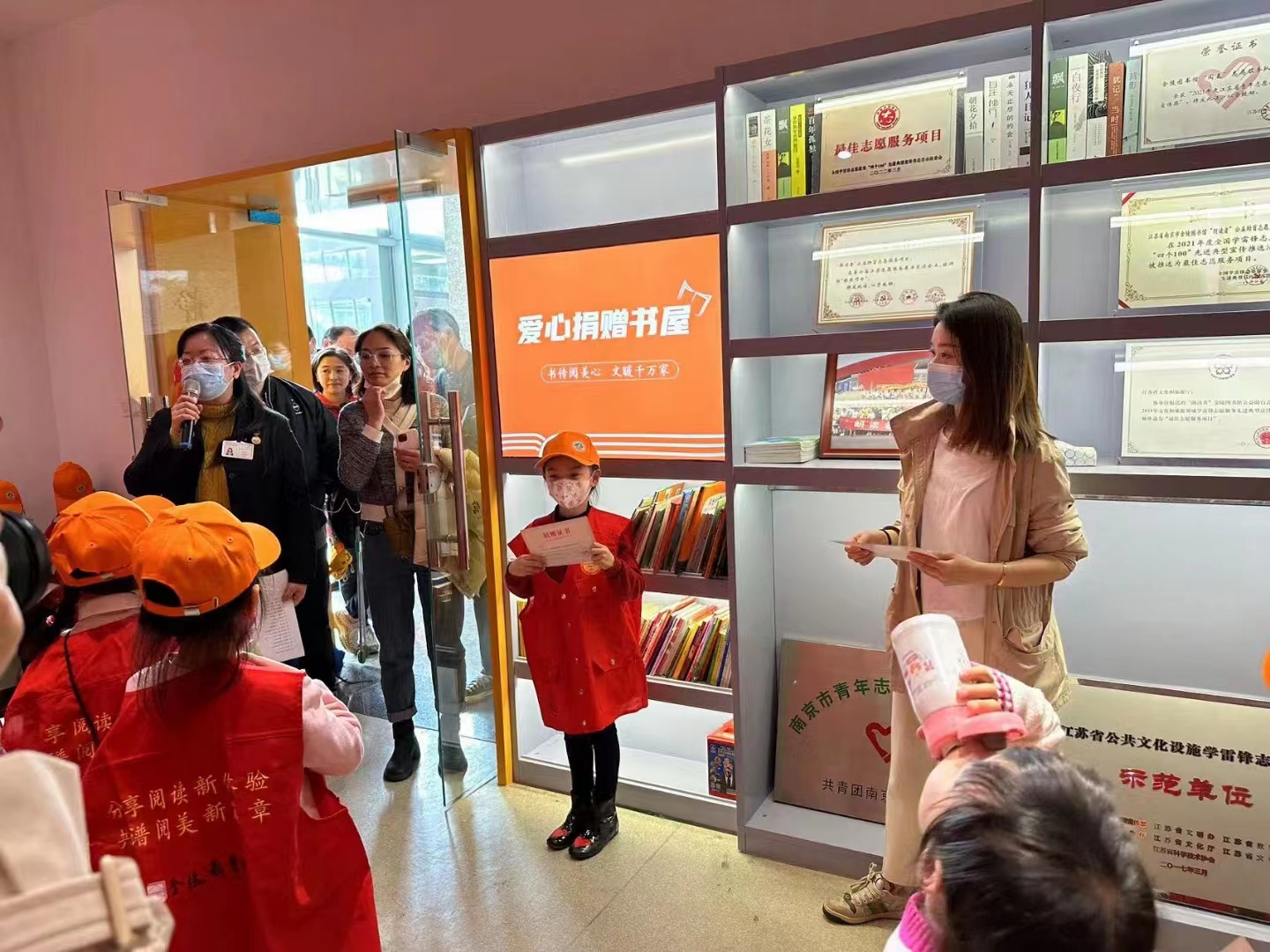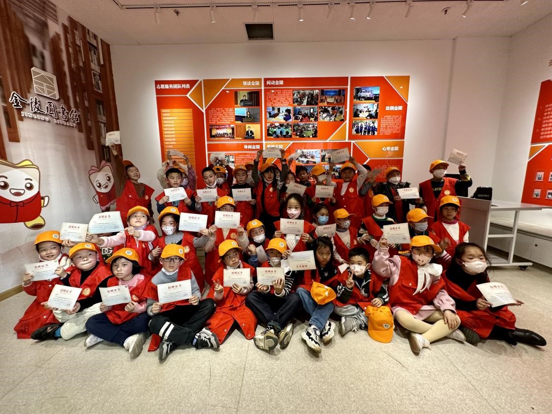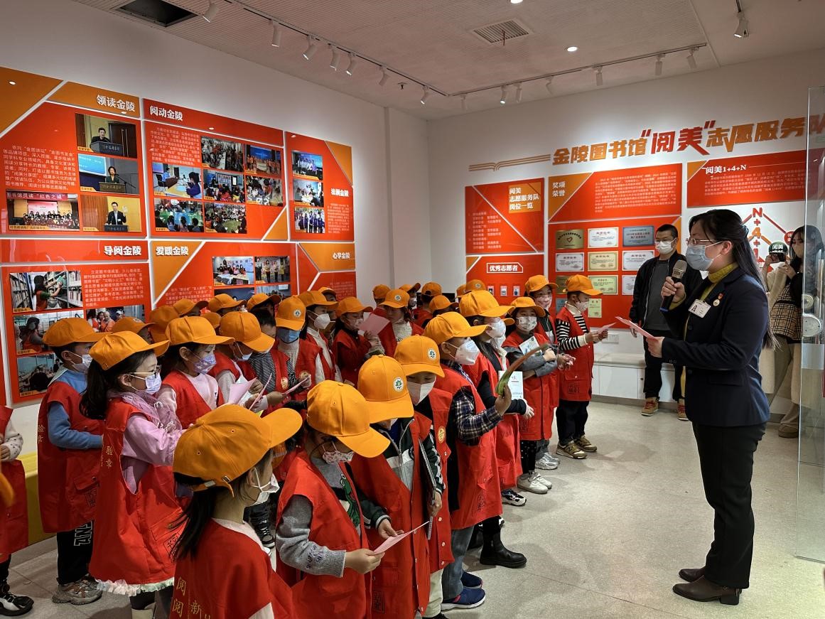 当天下午,来自金陵中学河西分校小学部一(2)班的37位小志愿者们,在金陵图书馆一楼“阅美”志愿天地(志愿者之家)集合,他们认真穿上志愿者红马甲,学习了志愿服务知识,了解了曾荣获2021年度全国学雷锋志愿服务“四个100”先进典型“最佳志愿服务项目”的金陵图书馆“朗读者”公益助盲志愿服务项目。
