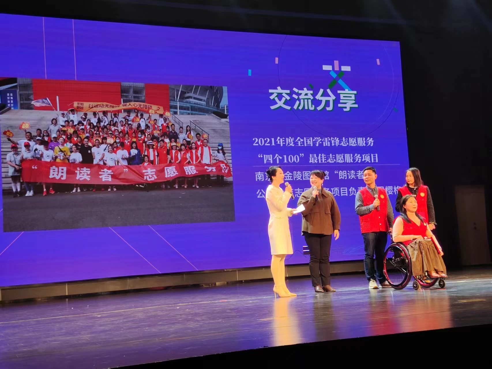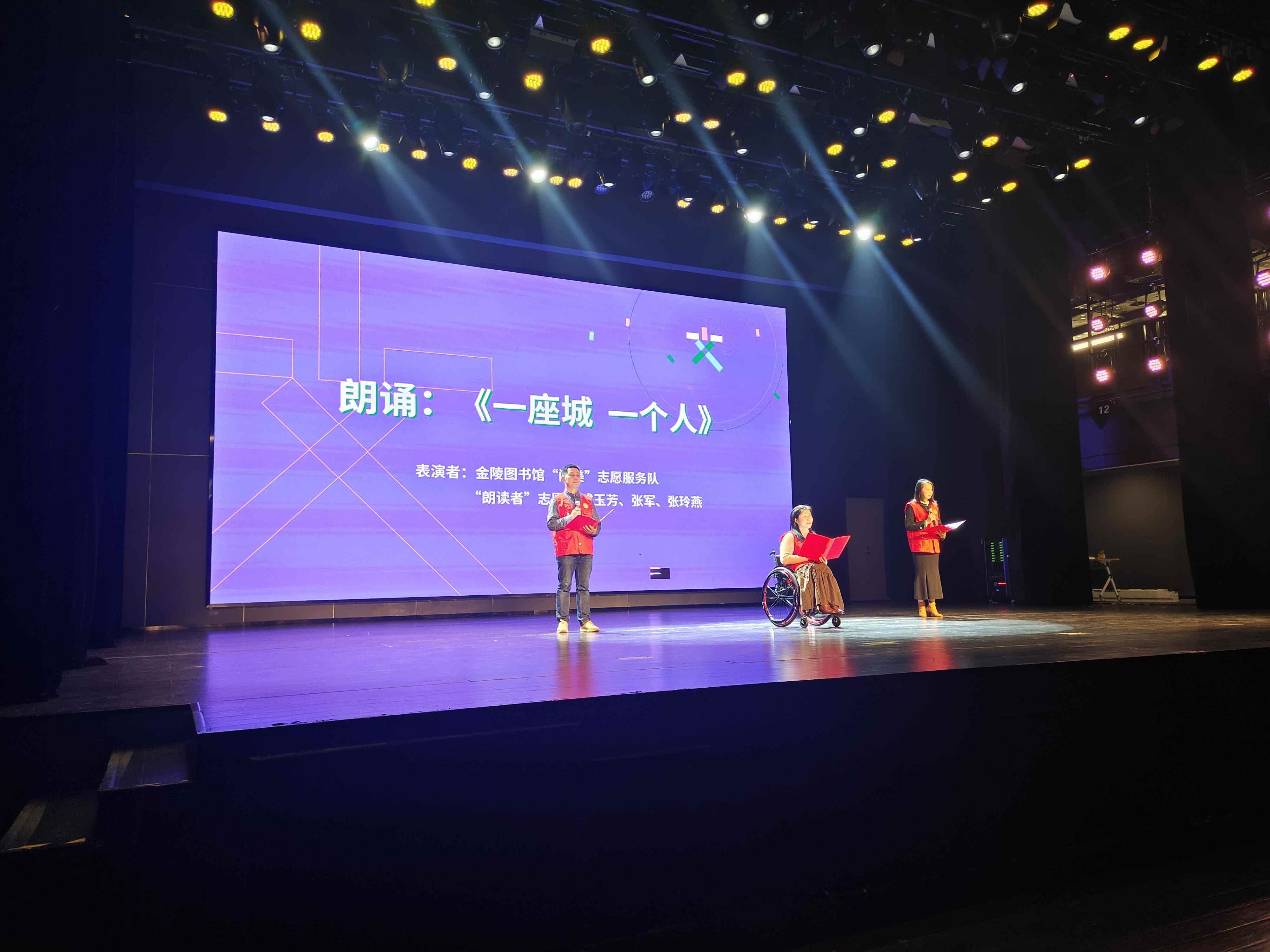 自2015年中宣部、中央文明办、民政部等部门联合推出全国学雷锋志愿服务“四个100”先进典型评选活动以来,南京共有31个典型入选。金陵图书馆“朗读者”公益助盲志愿服务项目已经耕耘12年,形成了独具特色的助盲志愿服务体系,这个项目入选了2021年度全国四个100的最佳志愿服务项目。该项目在现场分享中通过原创诗朗诵表达了朗读助盲、公益助残的志愿服务理念。