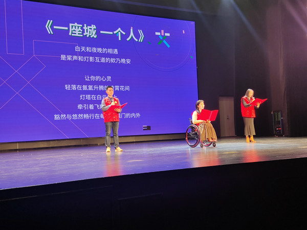 分享会现场,金陵图书馆“阅美”志愿服务队“朗读者”志愿者成玉芳、张军、张玲燕深情朗诵了《一座城 一个人》。该节目由张军原创,从目光、脚步、心灵三个角度去触摸南京的一山一水,将自己对家乡南京的热爱之情抒发笔下。金图“朗读者”团队组织创排成一首配乐诗朗诵,赋予朗读助盲、公益助残的志愿服务理念,从一个人到一座城,尽显南京“博爱之都”的温暖底色。用声音传递文化的温度,让文化的光芒照亮特殊群体的心田,用心用情的志愿服务是城市里最温暖的风景。随后,周樱格从服务理念、服务内容等方面进行了交流分享。