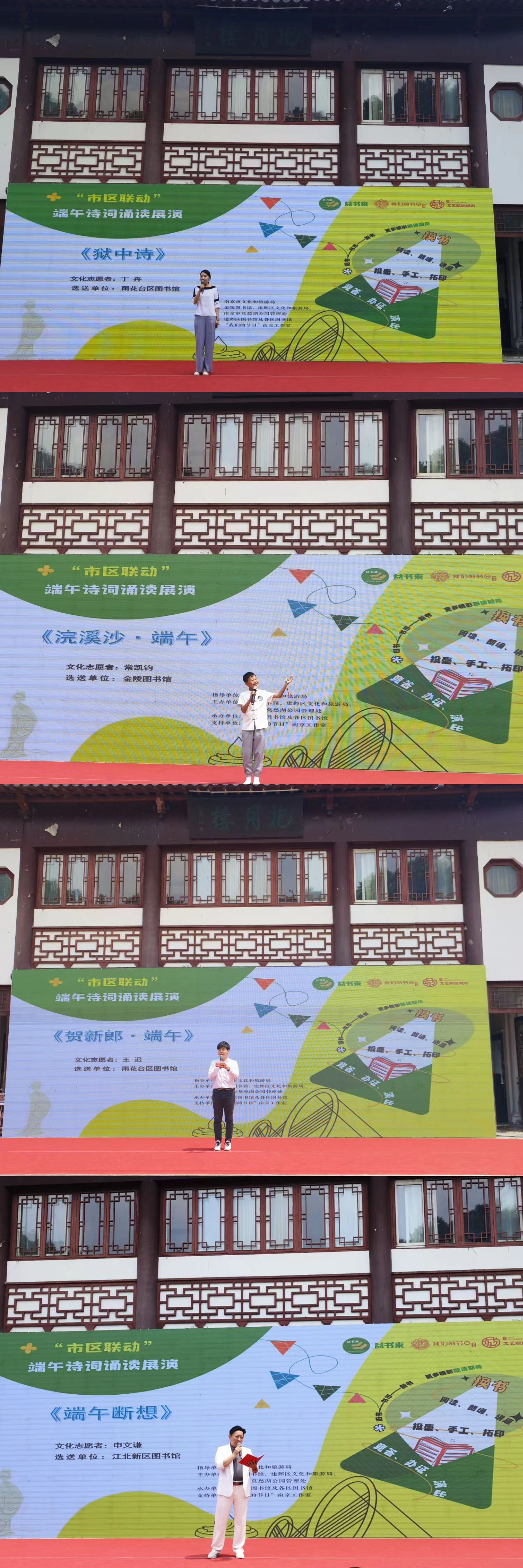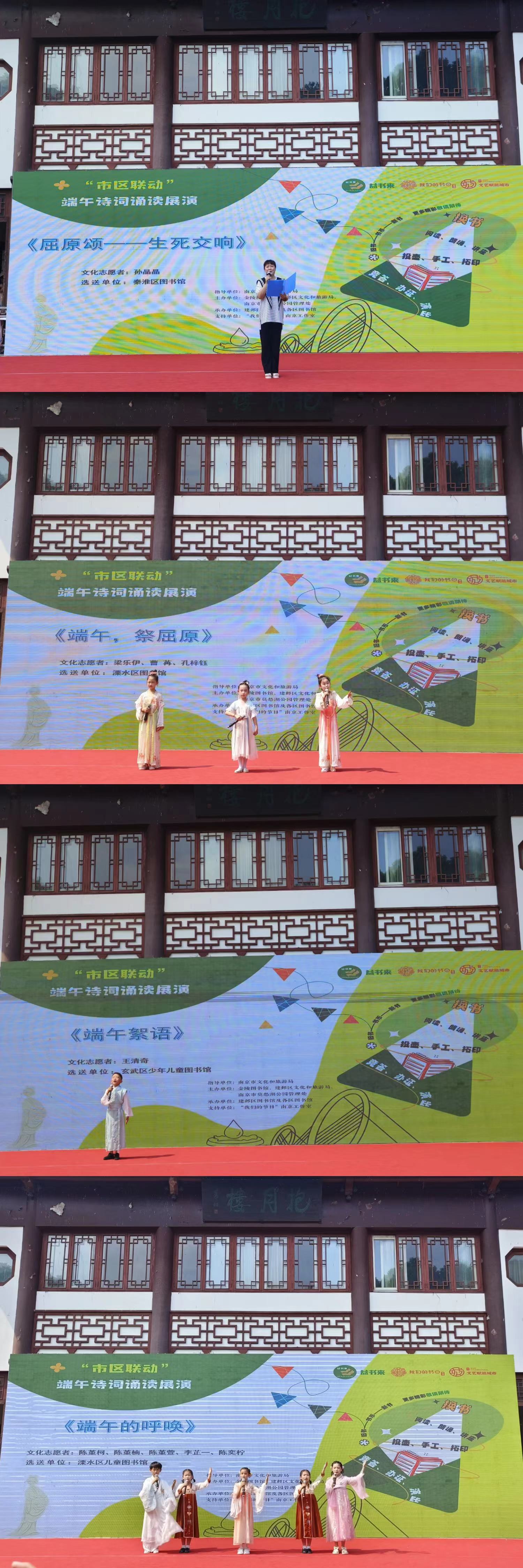作为本次活动的重要组成部分,在抱月楼前的表演区域,“市区联动”端午诗词诵读展演分别于10:00—11:00、14:00—15:00精彩呈现。来自南京市各区公共图书馆精心挑选的朗读志愿者们以字正腔圆的发音,深情演绎了一首又一首经典诗词,用公益诵读的方式弘扬中华优秀传统文化。