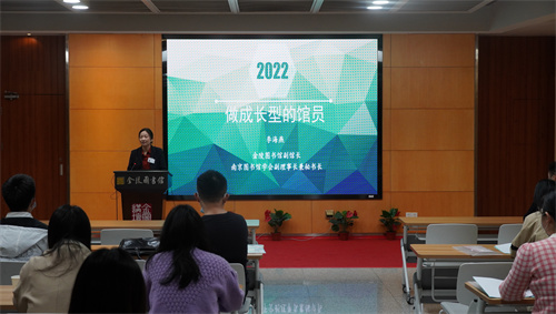 首先,金陵图书馆李海燕副馆长以《做成长型的馆员》为主题,并结合自己在金图的工作经历,就如何做一名成长型的图书馆员为新进馆员指点迷津。