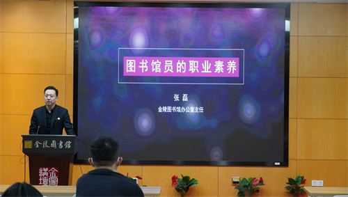 金陵图书馆办公室张磊主任则是以图书馆员的职业素养角度为授课主题,就图书馆员职业素养的定义、如何提升职业素养等方面,对新进馆员提出了寄语和希望。