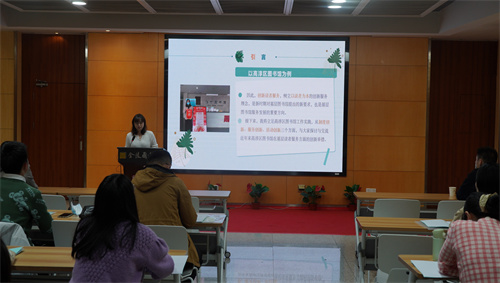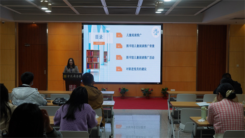 南京图书馆业务部梁雯雯副主任作题为《公共图书馆儿童阅读推广活动的思考》专题授课。她详细介绍了阅读对儿童的重要性、图书馆儿童阅读推广活动开展、儿童阅读推广人应具备的素质等等,使新进馆员们对儿童阅读推广有了更明晰的认识。