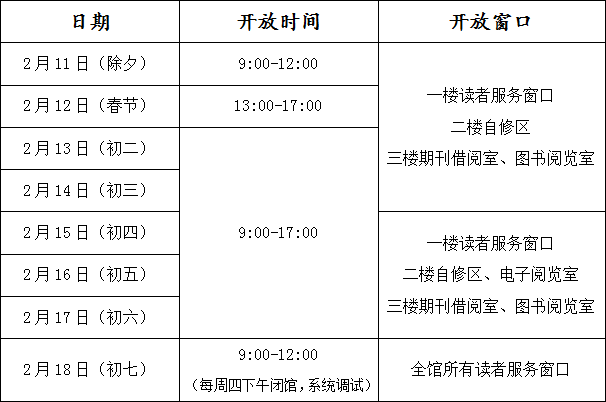 根据《国务院办公厅关于2021年部分节假日安排的通知》,金陵图书馆结合工作实际情况,将2021年春节期间具体开放时间和开放窗口安排如下: