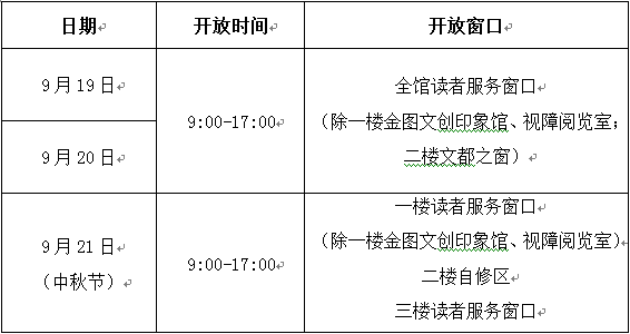 根据《国务院办公厅关于2021年部分节假日安排的通知》,金陵图书馆结合工作实际情况,将2021年中秋节期间具体开放时间和开放窗口安排如下: