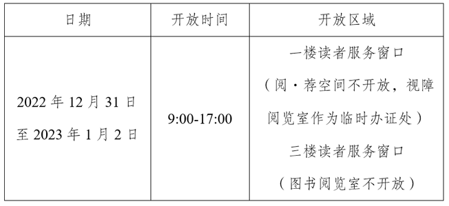 2022年12月31日至2023年1月2日开放部分区域,新街口地铁图书馆、职工食堂、890空间等暂不开放。
