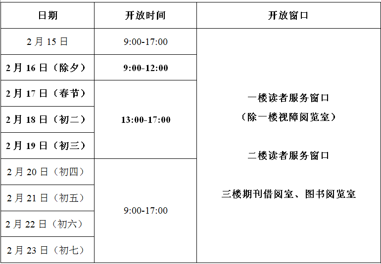 根据《国务院办公厅关于2026年部分节假日安排的通知》,金陵图书馆结合工作实际情况,将2026年春节期间具体开放时间和开放窗口安排如下: