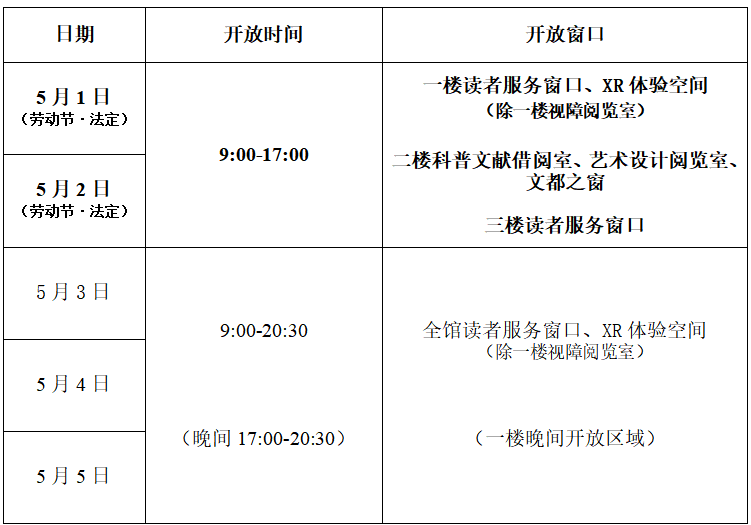 根据《国务院办公厅关于2026年部分节假日安排的通知》,金陵图书馆结合工作实际情况,将2026年劳动节期间具体开放时间和开放窗口安排如下: