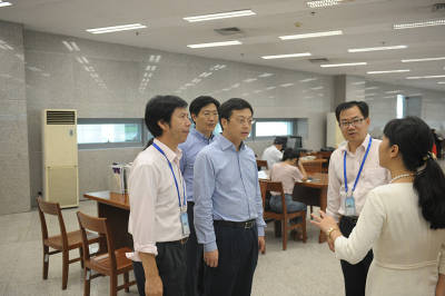 曹路宝一行依次参观调研了图书借阅部、文创中心、少儿借阅室、盲人阅览室、报纸阅览室、东借阅室以及展览厅、报告厅等我馆主要的读者服务阵地。在调研过程中,曹部长详细了解了我馆“你选书·我买单”的相关规则和流程,并且通过“我的南京”APP成功链接到我馆“阅汇点”平台,现场注册成为了金图的读者。曹部长通过深入了解和现场体验,对我馆的服务理念和服务方式赞赏有佳。他表示,“你选书·我买单”项目能够真正有效的实现市民读者的阅读“自主权”,这一创新服务值得进一步推广;“阅汇点”项目不仅能提高图书馆的服务效能,方便市民读者进行移动阅读,同时还能有效推动“全民阅读”的广泛开展,促进“书香南京”的建设。
