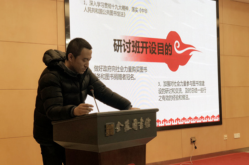 接下来,公共服务部华杰同志向大家介绍了他赴苏州参加“社会力量参与图书馆建设研讨班”的情况。他介绍了参与研讨班专家学者的观点,从图书馆现状与发展、建设与探索、诚信服务图书馆发展等角度对社会力量与图书馆事业发展进行了阐述。最后华杰结合个人思考,提出了应共建、共管、共享,以形成模式多元形式多样的社会力量参与共建新模式。