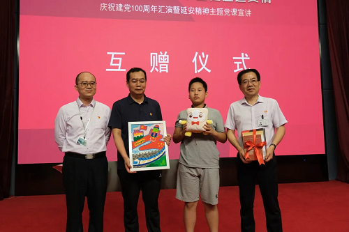 在精彩的演出之后,延安市图书馆馆长薛景春将延安精神主题文献赠予金陵图书馆,作为回馈,金图精心挑选了由本馆少儿读者创作的“童心向党”建党百年主题的绘画作品,小读者郑斯予亲手将画作《百年征途 光耀中华》赠送给薛馆长后,尹书记为他送上金图吉祥物图图,祝愿他像图图一样热爱阅读,茁壮成长。