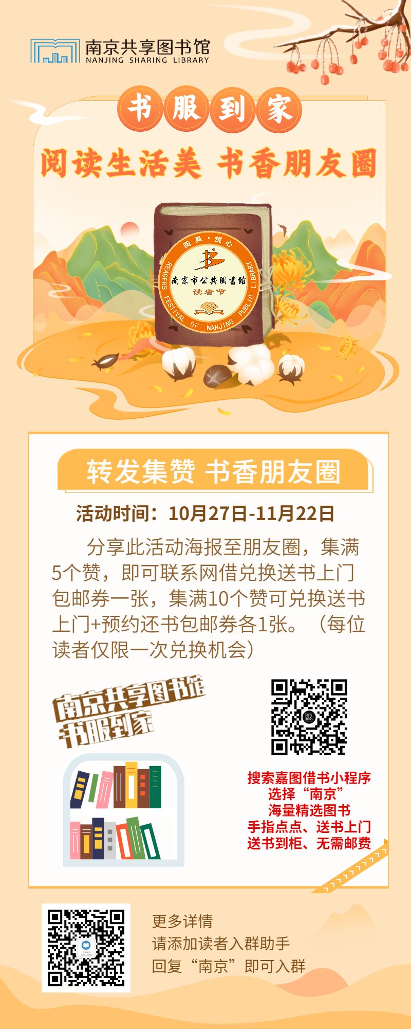 为进一步落实全民阅读根本任务,积极引导读者通过阅读经典开阔视野,南京共享图书馆面向读者开展“转发集赞 书香朋友圈”为主题的活动,以期更好地引导和鼓励读者与书为友,养成多读书、读好书的良好习惯。通过活动的宣传,让更多读者知晓书服到家平台,提升了南京共享图书馆的知晓度,提升了网借图书的借阅量。