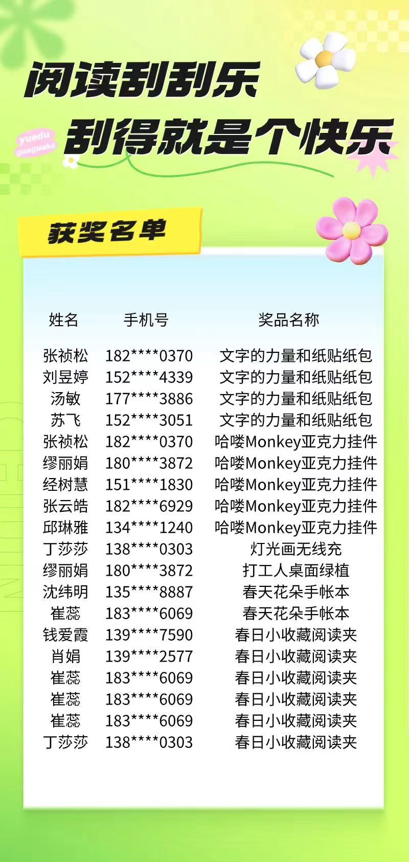 在美好的四月初春,让我们用阅读开启新的篇章,用每一次翻页去感受文字的魅力。书服到家同你一起刮走生活中的琐碎烦恼,以全新的姿态迎接充满生机活力的四月!找到属于自己的心灵栖息地,更能收获满满的幸福与满足感。恭喜以下读者,