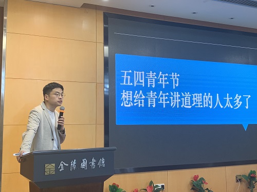 本次五四青年节活动特别邀请到“金锋团队”创始人、优秀青年导演蔡金峰,为金图青年馆员作了主题为《创业·奋斗·奉献》的分享会。蔡导分享了他创业过程中的各种经验与教训,希望能让在场的团员青年们知道,“吸取自己失败的经验是成长,但吸取他人失败的经验是天才”,以此激发在座青年的奋斗精神,唱响无愧于时代的青春之歌。