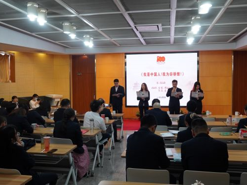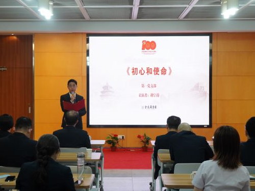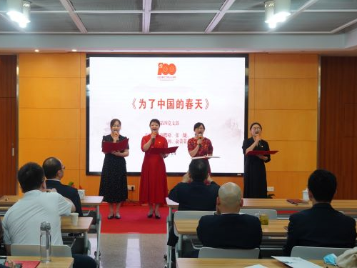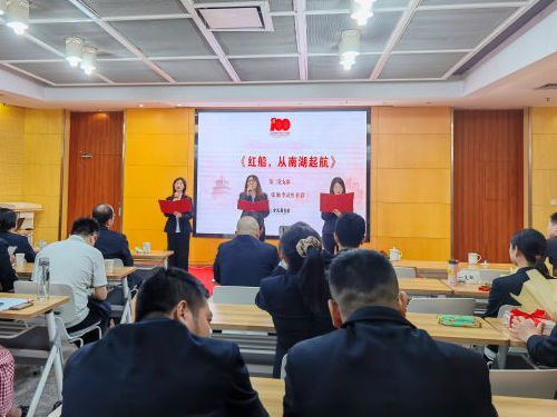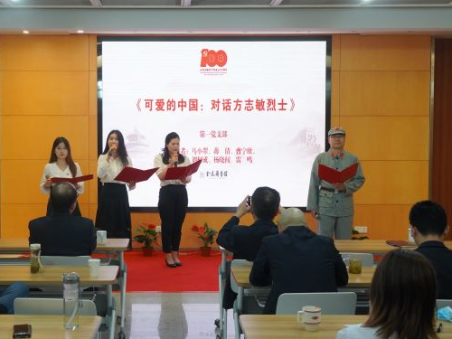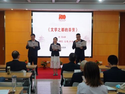 然后,各个党支部的作品竞相登台展示:一篇《红船,从南湖起航》回望了中国共产党诞生这一开天辟地的大事件;一篇《为了中国的春天》描绘了共产党人从血泊中奋起,在磨难中前行,创造了如今国泰民安、春满山河的盛世;一篇《可爱的中国:对话方志敏烈士》带领我们见证了无产阶级革命家、军事家、杰出的农民运动领袖方志敏同志的坚定信仰;一幕舞台剧《丁香》引领我们回顾了雨花英烈白丁香的事迹,展示了中国共产党人的崇高理想信念、高尚道德情操、勇于牺牲的大无畏精神。