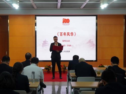 伴着激昂的乐曲,第四党支部首先为大家带来了原创诗朗诵《百年风华》,展现出这一百年来,无论形势多么复杂、环境怎么变化、任务如何艰巨,我们党都领导全国人民上下一心,创造了一个又一个“中国奇迹”。