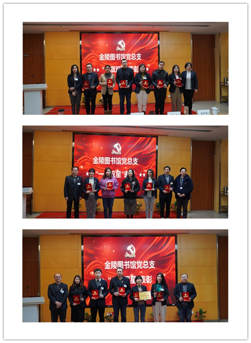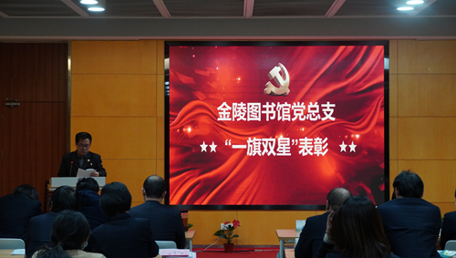 会议的第二项议程是2021年度金陵图书馆党总支“一旗双星”评选表彰。党总支副书记焦翔同志宣读名单,表彰中共金陵图书馆第四支部委员会为红旗党支部,仓健等12名同志为党员之星,马小翠等5名同志为党务之星。总支领导们上台为受表彰人员和集体颁发了“一旗双星”证书及奖杯奖牌,表达衷心祝贺的同时也希望各支部和广大党员“学有榜样、做有标杆”,进一步发挥共产党员的先锋模范作用,充分调动积极性、主动性和创造性。