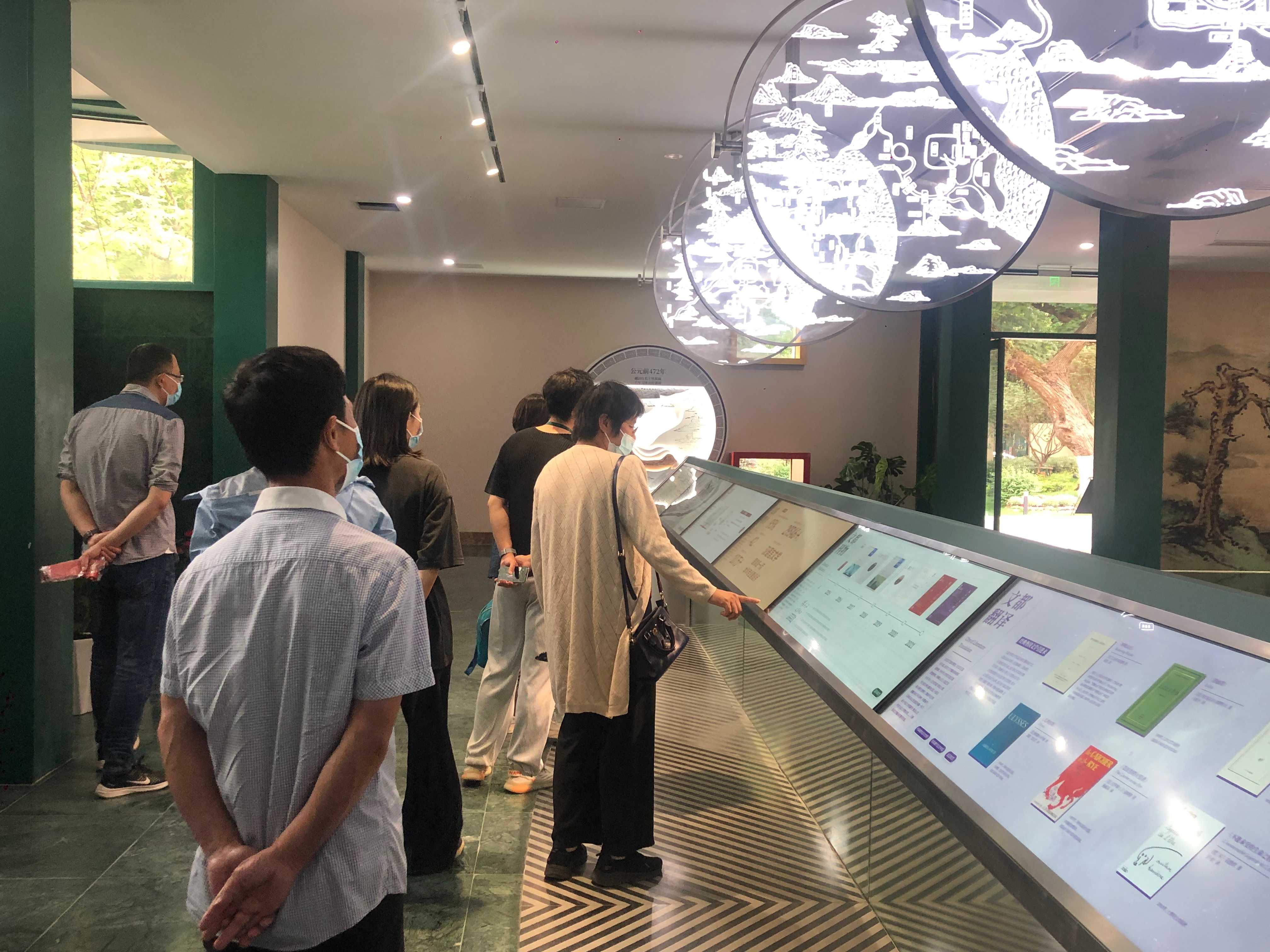 “世界文学客厅”主楼展馆分上下两层,分设文·脉、文·码、文·枢三个主题展区,配合院落内文·房、文·创共五个展项,体现古都文韵传承与创新空间的设计寓意。在这里,党员们通过聆听讲解、互动体验,了解公元280年至今、对南京文学发展产生重大影响的近千条文学事件,领略南京数个历史时期文学特色与成就,品读从近千条南京文学相关作品中精选出名篇名句。