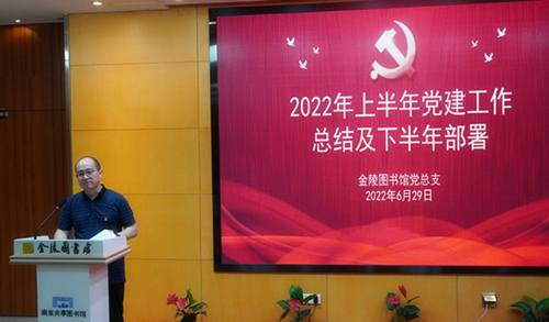 最后,尹书记作2022年上半年党建工作总结及下半年部署,从“强化理论武装,夯实党建基础”、“落实组织建设,筑牢战斗堡垒”、“坚定理想信念,锤炼政治品格”、“深化从严治党,践行初心使命”四个方面总结了图书馆基层党建成效,又规划了组织建设、政治引领、教育形式等下半年工作重点,推进党建和业务工作深度融合,以更加优异的成绩向党的二十大献礼。