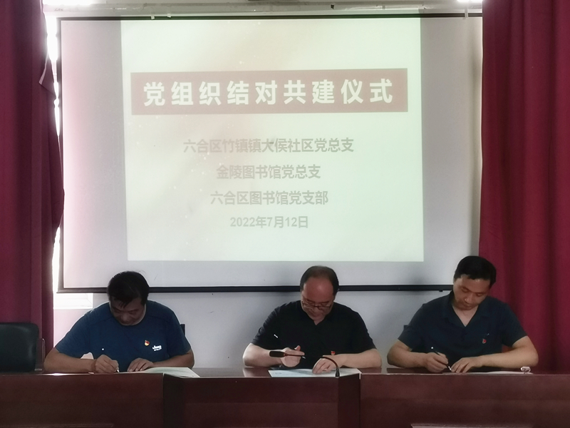 首先,金陵图书馆党总支与六合区竹镇镇大侯社区党总支、六合区图书馆党支部共同举办党组织结对共建仪式,签署《党组织结对共建协议书》。协议三方将秉承“资源共享、优势互补、注重实效”的原则,实现党建工作与文化事业发展良性互动,推动公共文化优质资源延伸供给,助力乡村文化振兴。