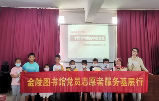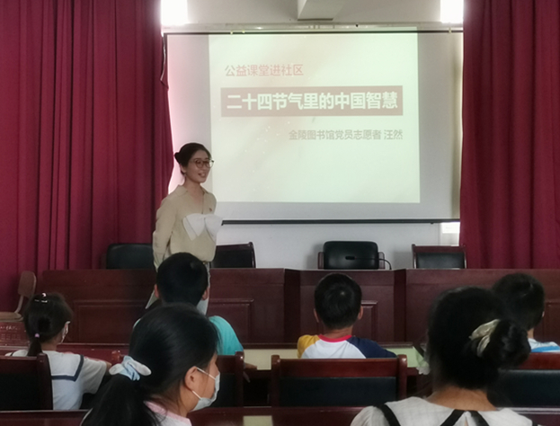 活动的最后,金陵图书馆党员志愿者汪然同志围绕“二十四节气里的中国智慧”,给社区小朋友们上了一节别开生面的公益课。课堂上,小朋友们踊跃回答发言,积极讨论分享,童言童语逗笑了旁听的家长和居民。在欢乐的氛围里,党员志愿者用生动的语言和活泼的形式,积极发扬和传承传统文化,丰富乡村儿童暑期生活的同时,更激发了孩子们的阅读兴趣。