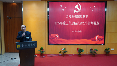 大会的第一项议程是由尹士亮书记作2022年度党总支工作总结。他从理论学习、换届选举、迎察整改、反腐倡廉、融合发展、一岗双责等六个方面对全年工作进行概括,并通报了金陵图书馆领导班子民主生活会召开情况和党建经费使用情况,部署了2023年党总支工作计划要点及党建经费预算计划,为新的一年开展好工作、创造出成绩奠定基础。