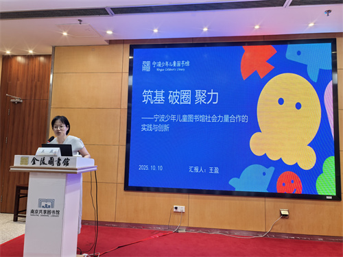 在“主题探讨·碰撞灵感”环节,宁波少年儿童图书馆少儿辅导部主任王盈以《“筑基”与“破圈”——宁波少儿图书馆社会化合作的实践与探索》为题,系统分享了该馆的创新实践。她详细介绍了通过引入专业社会力量,在图书排架、益智玩具馆管理等基础服务上实现“能力补充”的具体做法,生动展示了与荷花庄小学共建“书法研习基地”、与多所学校合作开展“信息素养课程”等“破圈”案例,并分享了“月度考核+流程再造”的保障机制,为图书馆构建可持续发展的服务生态提供了可复制的经验。