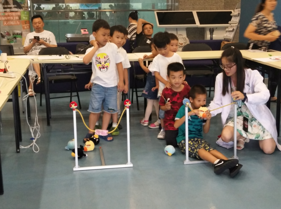每位小朋友都认真地在纸上设计出了心目中的弹弓。之后,小朋友们使用冰棒棍和皮筋,在家长的帮助下,制作出了心目中的神奇弹弓。小朋友们分为黄队和蓝队,拿着弹弓开始了比赛。比赛中,很多小朋友的弹弓都散架了,子弹也无法弹射,这是由于弹弓形状的稳固性不同。最后,小朋友们使用超级弹弓侠,与纸杯猪猪城堡展开了一场实体愤怒的小鸟保卫游戏。