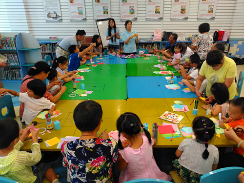 8月17日上午九点半,在金陵图书馆少儿活动室,蓝精灵手工坊和孩子们通过折纸贴画的方式一起打造了一个奇妙的海底世界。