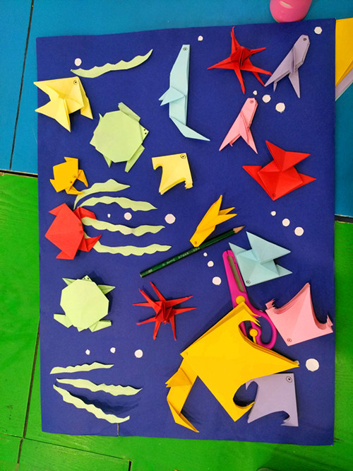 尽管台风来临,清早便是狂风暴雨,但小读者们依旧准时出现在活动现场,为今天的折纸贴画活动做好准备。今天,蓝精灵手工坊的主题是折纸贴画——海底世界,海底世界是什么样子的呢?一定是有各种各样的鱼、螃蟹和水草。首先,老师教小朋友们折叠几种简单的海底动物,有飞鱼、燕鱼、章鱼等;然后,老师拿出一张深紫色的背景纸,让小朋友们发挥想象,将折叠好的海底动物粘贴到背景纸上;最后,在小鱼嘴边贴上白色的小点点当作气泡,奇妙的海底世界就完成了。