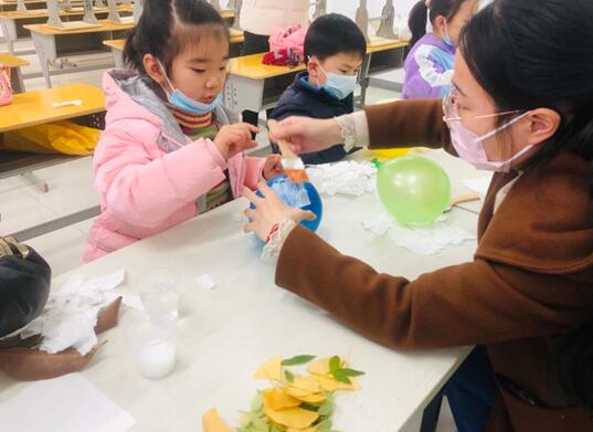 花草纸灯的制作步骤并不复杂。首先是吹气球,这一环节也是整个制作过程中最令小朋友们激动的。大家个个拿起气球嘟着嘴给气球吹气,气球的大小没有特别的规定,但考虑到后面的制作,老师要求孩子们把气球控制在直径15厘米左右。第二步需要用到刷子和纸了,这一步所用到的纸是一整张,不需要分层,撕成大小不一的形状,然后用清水将纸一层层的刷在气球上面,这么做也是便于后期好脱模。第三步是用制作好的,按照白乳胶与水一比一混合胶水进行第二层刷纸,这里需要注意的是,纸需要一分为二。第四步,是上纸的最后一层,小朋友可以根据自己的喜好拿花草对纸灯进行装饰,在花瓣叶片的位置刷一层纸,可以使其更好的固定住,随后便是等待晾干。最后,待纸完全干透后,用尖锐的物品将气球扎破,并修剪多余的边角,再打上孔,穿上麻绳与木棍,最后放上灯串,一个小巧精致的花草纸灯便完成了。