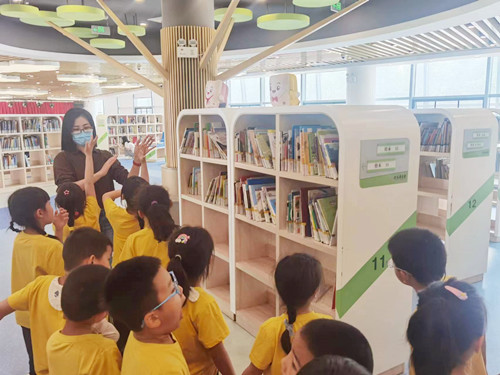 在少儿工作部三位老师的带领下,孩子们分别有序地参观了图书馆一楼的开放区域:图书借阅室、办证处、视障人士阅览室、童·阅空间。很多小朋友都是第一次来到金陵图书馆,对一切都充满了好奇和求知欲。老师们向大家介绍了图书的分类规则、图书架位的布局以及图书消毒机的使用方法,并且现场演示了自助借还机的操作;在视障人士阅览室里,孩子们在老师的引导下闭上眼睛,用指尖轻触盲文书籍,用心感受视障人士对阅读的渴望和对知识的渴求。