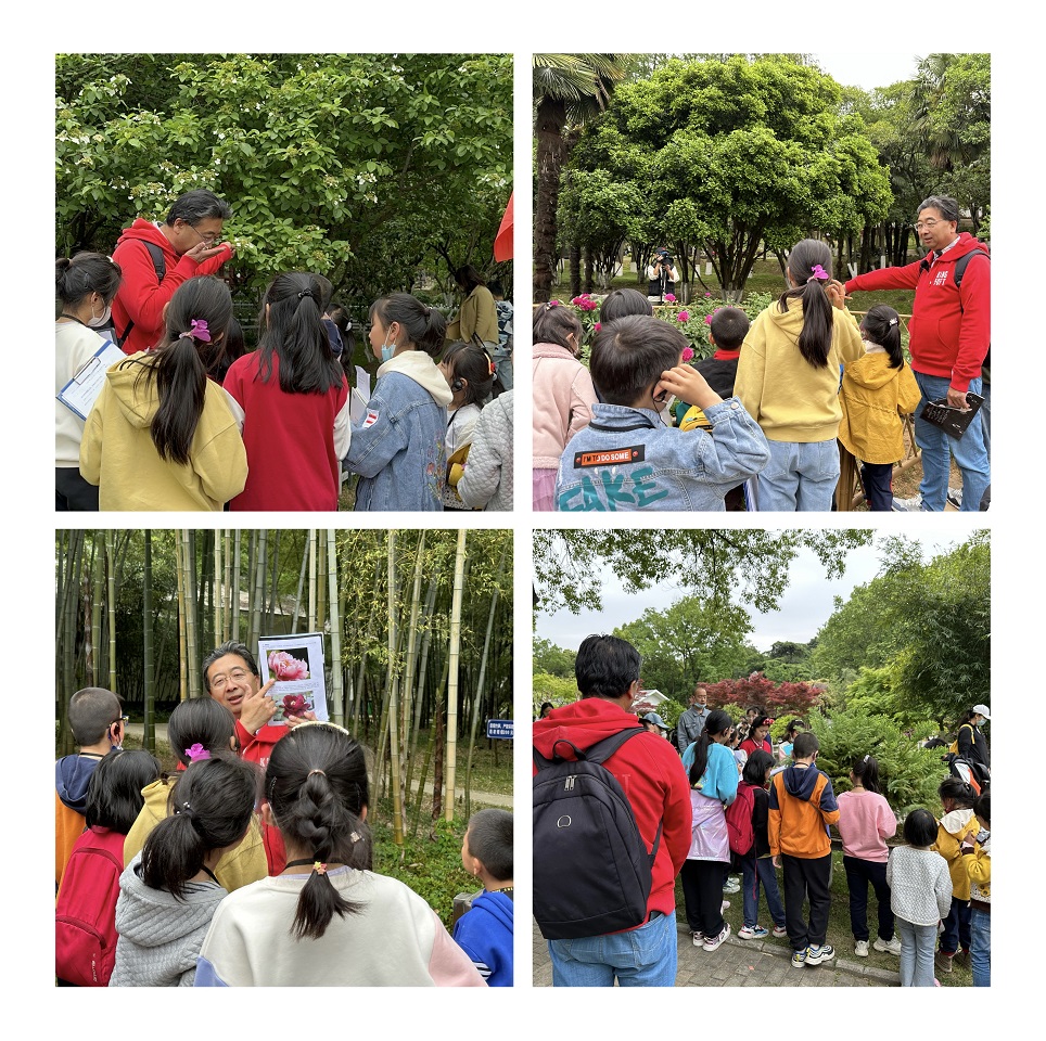 移步至杜鹃坡处,孩子们在仁和老师的指引下开始观察杜鹃花,闻花香,看花形,孩子们时不时交头接耳,小声交流着自己所观察到的花朵。随后一群人便行至盆景园,在这里小朋友学习了盆景观赏的相关知识,比如赏根、赏干、赏叶、赏花果等,从局部或整体去欣赏盆景的意境美、自然美。漫步至牡丹园,仁和老师在此为孩子们讲授牡丹的种类品相,并让孩子们寻找特定的牡丹种类。在牡丹园一隅,仁和老师同孩子们发现了二乔牡丹,一花开两色,极具观赏性。
