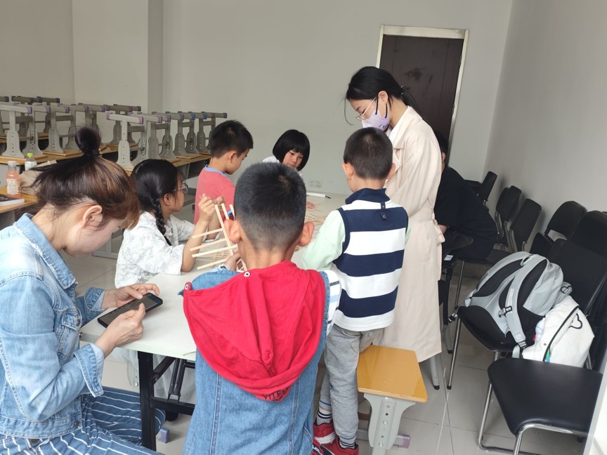 课程一开始,老师先拿出了提前编织好的竹编小船,向大家讲述了竹编的发展历程。接着给每位同学分发七根竹条,其中四根作为船底,三根作为船身。竹编船的制作并不复杂。先竖向摆放四根竹条,用胶带固定,再用剩下的三根竹条分经纬插入,并压一挑一。然后将船底左右两边用玉线固定,再将其船身竹条拱起用玉线扎紧,一个简易竹编小船就大功告成啦!不过,制作看似简单,但是在动手操作过程中,孩子们也是遇到了些小问题,例如竹子稍硬、不小心掰断、扎不牢,甚至散开等情况,但最后在老师和家长的帮助下,大家都顺利完成了。