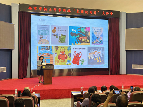随后,今天的主讲嘉宾,江苏省特级教师、南京市北京东路小学附属幼儿园吴邵萍园长为大家带来《通过绘本阅读,自然衔接》的精彩讲座。吴园长从绘本的看、听、说、演、写几个角度,结合生动的绘本案例和教学实例,为大家提供了绘本阅读的方法与指导建议;根据孩子的年龄特点,推荐了一系列主题内容丰富的绘本读物。优秀的绘本作品层出不穷,创意之巧妙、主题之多样,给家长和老师们提供了丰富的选择。吴园长强调,幼儿享受每个阅读点的发现和思考,讨论的过程,这些对幼儿发展的价值和影响是终身可持续的。