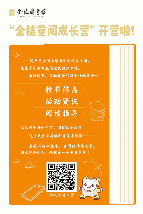 金陵书香似桔香,童阅共读伴成长。“金桔童阅成长营”于今年4月正式推出,是金陵图书馆专为少儿读者及其家庭打造的一个关于图书推荐、活动分享、阅读指导的线上交流互助平台。该社群以真实互信为原则,依托少儿分级阅读理论,充分发挥图书馆对家庭阅读的指导作用,引导家庭从小培养孩子的阅读习惯,积极参加阅读活动,提升阅读素养。今后将推出更多主题的少儿阅读推广活动,欢迎扫码报名加入!