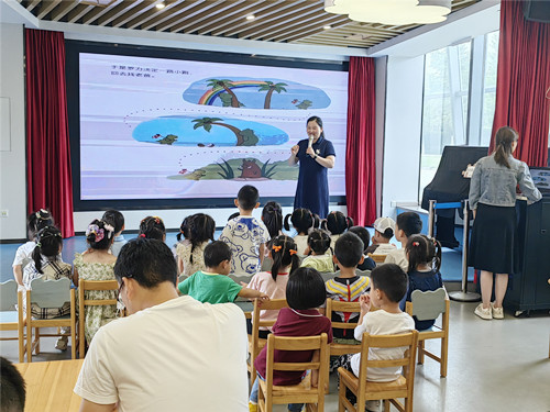 故事结束后,老师带领小朋友们进行一场音乐律动。随着音乐《我的身体都会响》的响起,小朋友们跟着老师动作起来。快乐的音乐,简单的动作,老师教会了小朋友们,小朋友们一起在舞台上跳了起来。