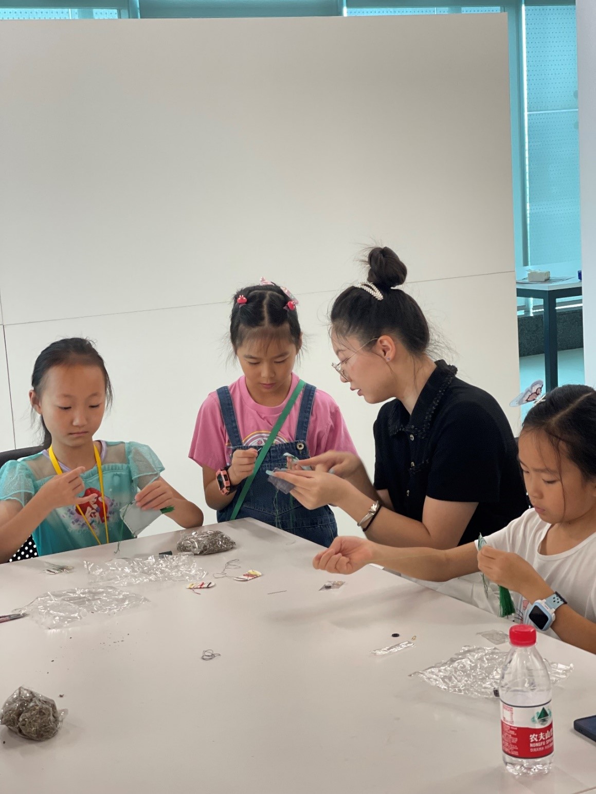 本次活动制作的是手工粽子香囊。所需工具有:印花布片、挂绳、流苏、针线、胶珠、艾草等。制作的第一步是将布料反面朝外对折,注意挂绳要被布料包裹,且小圈露出;第二步,沿边缝合侧边,注意固定挂绳;第三步,固定流苏并继续缝合,注意要留一边不缝;第四步,从内向外翻转布料,翻转后往里填装艾草香料,留口两边向内折;第五步,缝合最后一个边作为收尾。至此,一个粽子香囊就制作完成了。需要指出的是,小朋友们在缝线这一步时容易走线歪斜,导致空隙太大,艾草易漏出,好在有老师的指导,大家都及时纠正了错误。缝至最后几步,小朋友们已经能够掌握缝缀技巧,且都独立完成剩下的步骤。