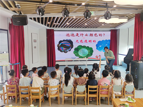 吹泡泡是每个孩子都喜欢玩的一种游戏,泡泡是什么颜色的,是五颜六色的?还是透明的?泡泡有哪些形状?圆的、椭圆的、三角形的还是心形的?本期青苹果科学园,老师带领着小朋友一起花式吹泡泡,吹出彩虹泡泡桥!活动开始,老师用图片和视频的形式,为孩子们展示了各种各样有趣的泡泡。有些泡泡颜色绚丽,五彩缤纷,有些泡泡颜色透明,朴实无华。聪明的小朋友们很快就发现了泡泡颜色的差异,纷纷向老师提问,为什么同样都是泡泡,颜色却不同?老师耐心地给小朋友解释,由于太阳光在泡泡的表面产生了折射现象,使得原本透明的泡泡变化出各种颜色。科学原理解释清楚后,老师带着小朋友们一起开始了今天的实验——制作彩虹泡泡桥。拿到工具的小朋友迅速地开始了自己的科学小实验。很快,小朋友就发现,杯底剪了个洞的一次性纸杯可以吹出一个大泡泡、带有小孔的棉柔巾可以吹出很多绵密的小泡泡、吸管和小塑料圈也可以制造出一连串的泡泡。在老师的示范下,小朋友们仔细地观察着泡泡的变化。接下来,老师在溶液中增加了洗洁精的比重,加大溶液的浓度,然后把充分浸泡在水中的工具轻轻地往上一提,在空中巧妙地划过一条弧线,一道长长的泡泡桥就出现了。小朋友兴奋地鼓掌叫好!为了增加实验的趣味性,老师在溶液中增加了不同的颜料,同时,变化着手的力度和方向,一个个漂亮的泡泡桥就出现了,小朋友们看到实验结果高兴极了,迫不及待地开始了自己的探索。不一会儿,各种五颜六色,形状各异的泡泡出现了,小朋友们纷纷伸出小手,试图抓住自己的泡泡,现场欢声笑语不断。
