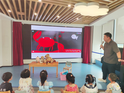 活动现场,老师带领小朋友们一起共读绘本《Little white fish》(小白鱼)。故事的主角是一条小白鱼,在一望无际的大海里,这条小白鱼和妈妈走散了。于是,勇敢的小白鱼开始了自己寻找妈妈的旅程。虽然故事内容简单,但是情节温馨有趣,小朋友们在帮助小白鱼找妈妈的过程中,学会了遇到危险要沉着冷静,遇到困难要开动脑筋,运用自己的智慧解决问题。绘本阅读中,老师用丰富的肢体动作,声情并茂地演绎了故事中的精彩情节,小朋友们听得津津有味,很快就掌握了绘本中关于海底动物如:fish(鱼)、octopus(章鱼)、crab(螃蟹)、whale(鲸鱼)等英文单词。在游戏互动环节,老师准备了贴合绘本主题的小游戏——找妈妈。老师将各种大小不同的动物玩偶,分别放在两个不同的袋子里,孩子抽取袋子里的玩偶,为玩偶找妈妈。在游戏中,老师鼓励孩子大胆说英语,孩子们边玩边学,在寓教于乐中巩固了绘本中的核心单词和句型。