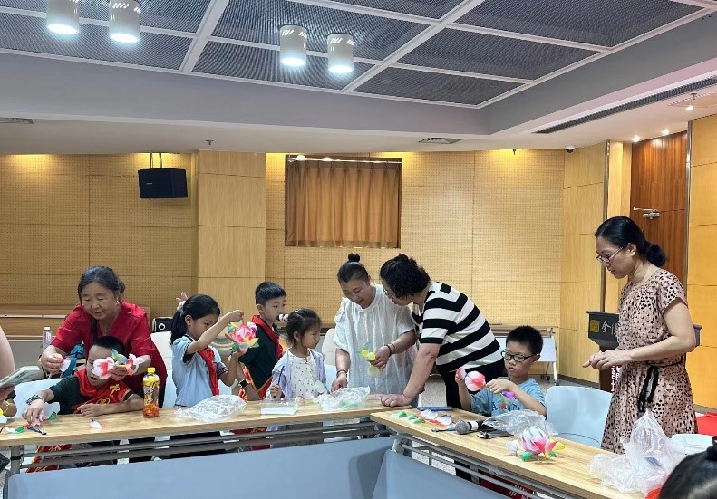 接下来是小读者们亲手制作荷花灯的时间。他们认真聆听黄老师讲解,按照步骤粘贴荷花花瓣,细心整理花灯骨架造型,看着手中的花灯渐渐立体起来,小读者们充满了自豪之情。