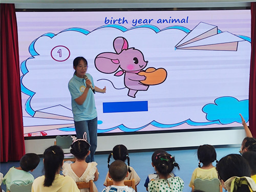 生肖是中国传统文化中的重要组成部分。本期绿巨人口语秀,老师用英语演绎中国传统优秀文化,带领小朋友们一起共读绘本《What’s your birth year animal》(十二生肖)。活动开始,老师邀请小朋友一起跳了一段可爱的动物舞蹈。伴随着轻松愉快的音乐,小朋友们扭动着自己的身体,模仿着视频中小动物的形态,化身成一只只可爱的兔子、活泼的猴子、憨态可掬的小狗、温顺的小绵羊等动物,舞蹈活跃了课堂的气氛,消除了小朋友的紧张情绪。接着,老师展示了生肖动物的图片和视频,引出本期绘本的主角——十二生肖。在游戏互动中,老师和小朋友玩起了生肖捉迷藏的小游戏,老师将生肖图片按照一定顺序摆放,然后抽出其中一张或几张图片,小朋友们抢答哪些生肖消失了。最受欢迎的游戏是“大家快来猜”,老师用阴影掩住了生肖动物身体的大部分,通过短语和单词描述动物的特征,小朋友一起猜是什么动物。在游戏中,孩子们不知不觉地掌握了rooster(鸡)、dog(狗)、 monkey(猴)、horse(马)、 rat(鼠)、pig(猪)等绘本中出现的核心单词。在绘本阅读中,老师用丰富的肢体动作模仿各种生肖动物的性格特点,小朋友被逗得哈哈大笑。在亲子手工环节,小朋友认真地用彩笔给自己的生肖涂颜色,不一会儿,大家就出色地完成了自己的作品。在老师的鼓励下,小朋友拿着自己的作品上台展示,并用 “My birth year animal is... I am ...years old.”的句型介绍自己的生肖和年龄。现场气氛欢快温馨。