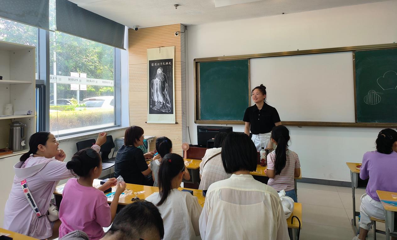 8月5日上午,“非遗学堂”系列课程在金陵图书馆105教室开展了一次制作仿点翠头饰的体验活动。
