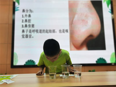 最后,老师让每个孩子依次上台开展探究体验,每个人去闻一闻现场准备的不同液体,用观察、比较、分类的方法去识别气味,教会孩子们懂得爱护舌头和鼻子。