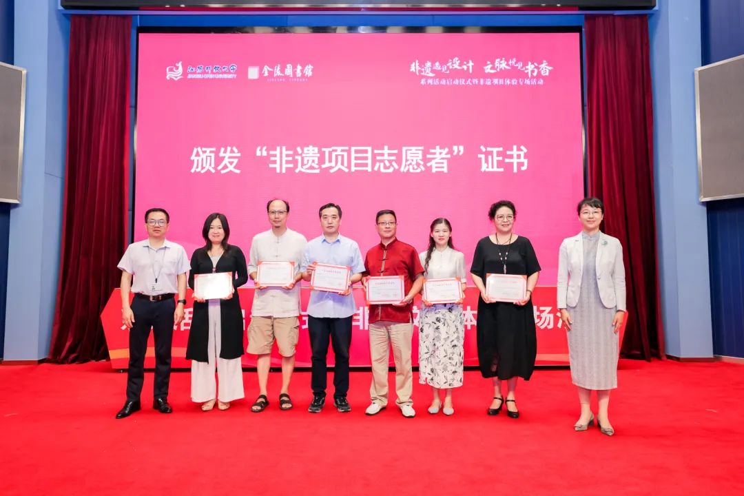 金陵图书馆副馆长杨峥代表“馆校合作”双方介绍了项目整体情况。江苏开放大学副校长罗逾兰和金陵图书馆馆长焦翔向6位非遗传承人代表颁发了“文化志愿者”证书,非遗传承人扼要地介绍了各自传承的非遗项目,期间金陵木偶非遗传承人现场演绎了精彩节目。接着,江苏开放大学设计学院院长姜春艳和金陵图书馆副馆长杨峥,江苏开放大学设计学院党总支书记邹佳和江苏省文化产业协会秘书长张玉英分别向学生代表颁发了“非遗小使者”证书。与会领导和6位非遗传承人代表共同启动主题活动仪式,系列活动正式拉开了帷幕。
