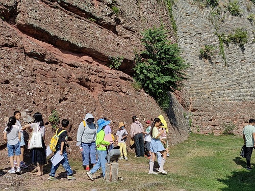 活动开始前,仁和老师用一个个小问答打开了孩子们的话匣子,大家一边踊跃发言一边认真学习相关知识讲解。随后,一行人在仁和老师的带领下领略了石头城的瑰丽风景,城门呈瓮形,虽然城楼已经不复存在,但是里面的砖石保存完好,在城门内凝望,仍然看见每一块砖石上的阴阳刻印,有的磨损严重,有的清晰可见,仿佛诉说着几百年来金陵城的变迁。在城墙临河拐角处有几个突出的红黑相间的石壁块,好似奇怪的鬼脸,加上池塘倒影,形成了“鬼脸照镜子”的独特风貌。