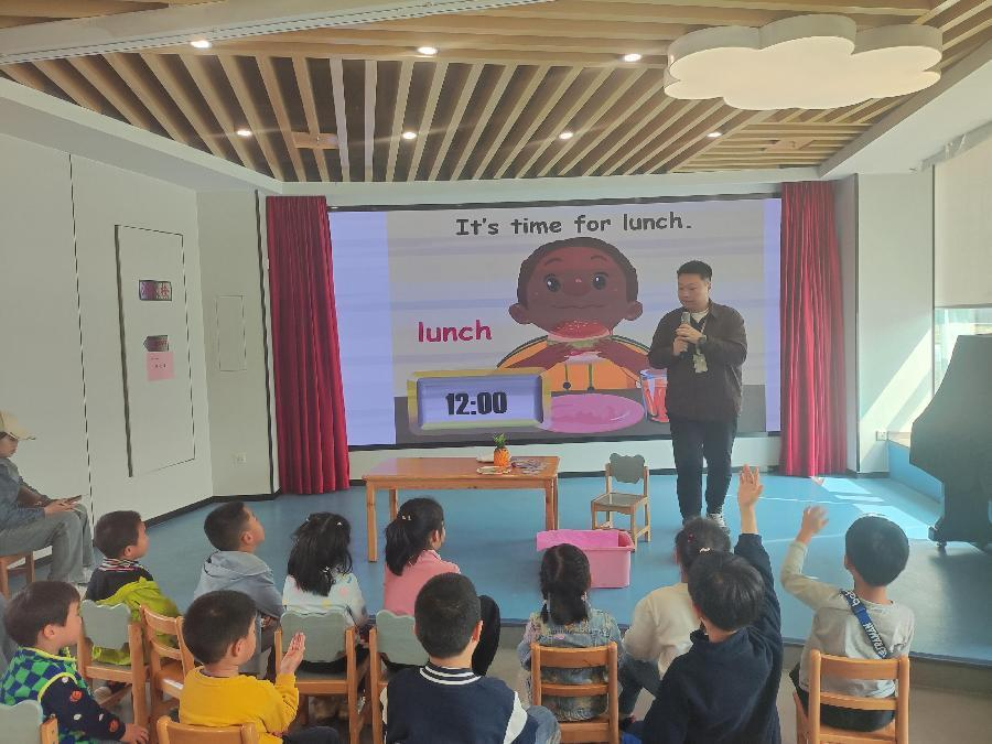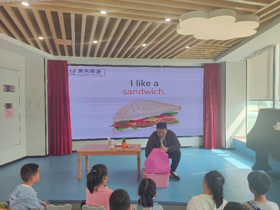 为了让小朋友们身临其境地感受到自己动手制作三明治的快乐,老师发给每位小朋友一张任务卡片。大家根据卡片上的要求,在食物道具中找到所需要的食物,然后自己动手DIY制作一个三明治汉堡。“I have a cheese sandwich! This is my egg sandwich! ”不少动作快的小朋友轻松完成任务,他们兴奋地走上舞台,用英语向大家介绍自己的作品。在互动游戏中,小朋友们不仅收获了快乐,也学会了许多食物名称的英语单词。 为了培养孩子们健康阳光的性格,让孩子们收获更多的友谊,在绘本阅读环节,老师挑选了以分享为主题的英文原版绘本故事《Pete the cat-Pete’s big lunch》。《Pete The Cat》系列绘本是一套畅销美国的儿童情绪管理绘本,故事的主角是一只活泼开朗、聪明可爱的皮特猫。不同于其它猫的特立独行,皮特猫热情、自信、勇敢。它喜欢交朋友,挑战新任务。通过阅读绘本故事,孩子们认识到Sharing is cool(分享是快乐的)! 活动最后,老师带着大家一起唱了首节奏欢快的英文歌《I am hungry》,在轻快的音乐声中,本期小水滴英文读书会落下帷幕。