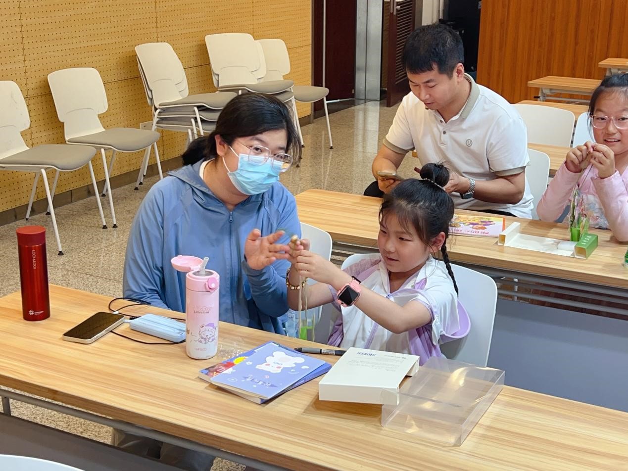 在文创手工环节,王老师向小读者们介绍了何为“天中五瑞”。“天中五瑞”是传统绘画主题“端阳清供画”的常见形式之一,人们通过创作此类型的作品,以期用“五瑞”防“五毒”,求得吉祥平安。此次小读者们制作的“天中五瑞”多层立体挂饰精选国家图书馆馆藏古籍中菖蒲、蜀葵、石榴、蒜头和枇杷这五种寓意美好的植物及果实图样组合在一起,错落置于花篮之中,呈现出繁花锦簇之感,悬挂家中,祝愿身体健康、好运常伴。